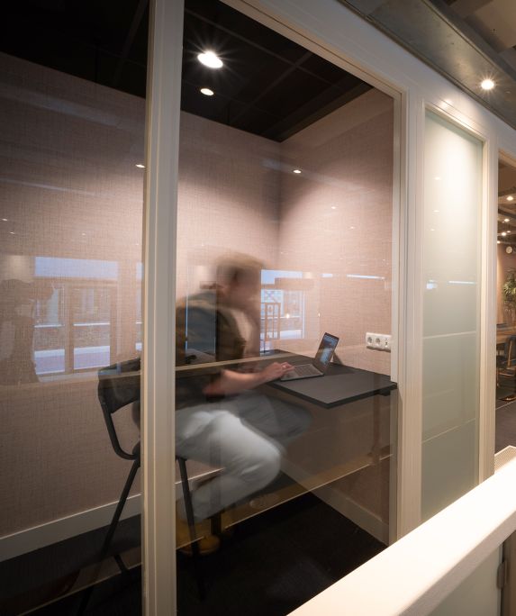 Nadat we de ruimte hadden leeggemaakt, hebben we nieuwe metal-stud wanden geplaatst om de nieuwe indeling te creëren. Dit resulteerde in vier kantoren, een vergaderruimte en vier stilteruimtes, perfect voor zowel samenwerking als individueel werk. Daarna hebben we de houten pui aangepast en nieuwe kozijnen en glazen deuren geïnstalleerd, wat de ruimtes zowel functioneel als stijlvol maakte. Het gebruik van glas en hout gaf het kantoor een moderne en open look.