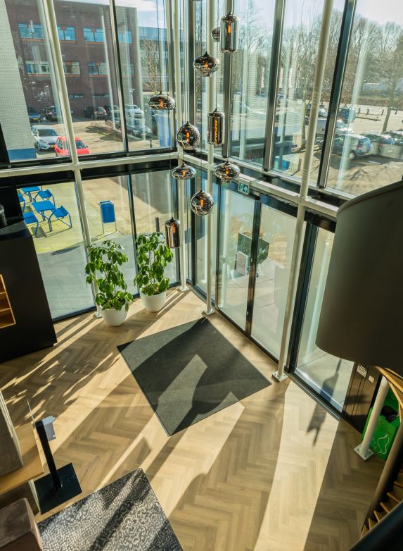 We hebben de entree, de kantine en de vergaderruimte op de begane grond voorzien van metal stud wanden, glazen wanden, systeemplafonds en verlichting. Daarnaast hebben we voor het schilderwerk en de vloerafwerking gezorgd. Ook hebben we een sfeervolle entree met een open structuur gerealiseerd. Dé eyecatcher van de entree is de wenteltrap, die middenin de ruimte staat. Daar kun je niet omheen! In verschillende ruimtes hebben we akoestisch spuitwerk toegepast om de galm te minimaliseren. Ook hebben we op meerdere verdiepingen een pantry geplaatst en hebben we installatiewerkzaamheden verricht. De eigentijdse visgraatvloer geeft het pand een moderne, industriële uitstraling waar de opdrachtgever naar op zoek was.